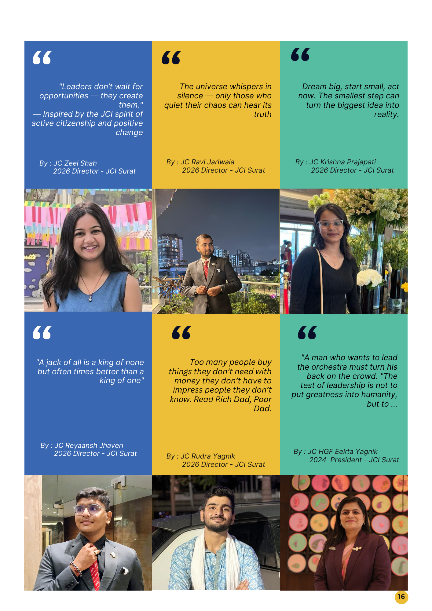 Co-editor for JCI Surat's Bulletin Magazine. Storytelling, content creation, photography, and community showcasing.